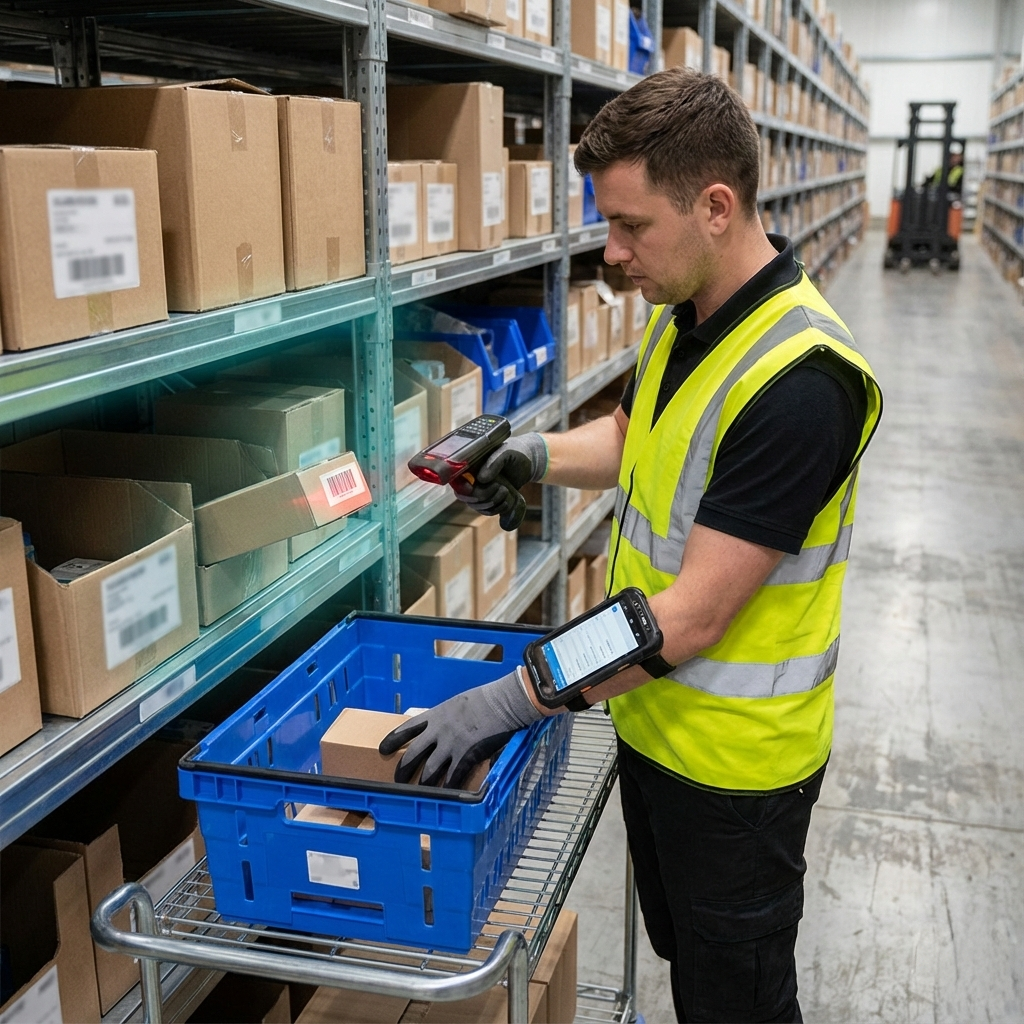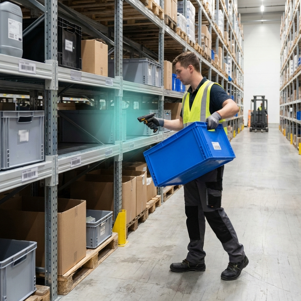 Artikel, Rohstoffe und Fertigwaren werden schnell und präzise entnommen. Die mobile Oberfläche führt Mitarbeiter effizient durch das Lager.